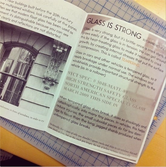 My favorite use of the electronic version of Toronto Subway is in a zine series called Material Evidence, created by Toronto native, engineer, professor, materials scientist, and HiLobrow contributor Deb Chachra. Appropriate for the makeup of the tiles upon which this typeface was originally used, the first issue of Material Evidence concentrated on glass.